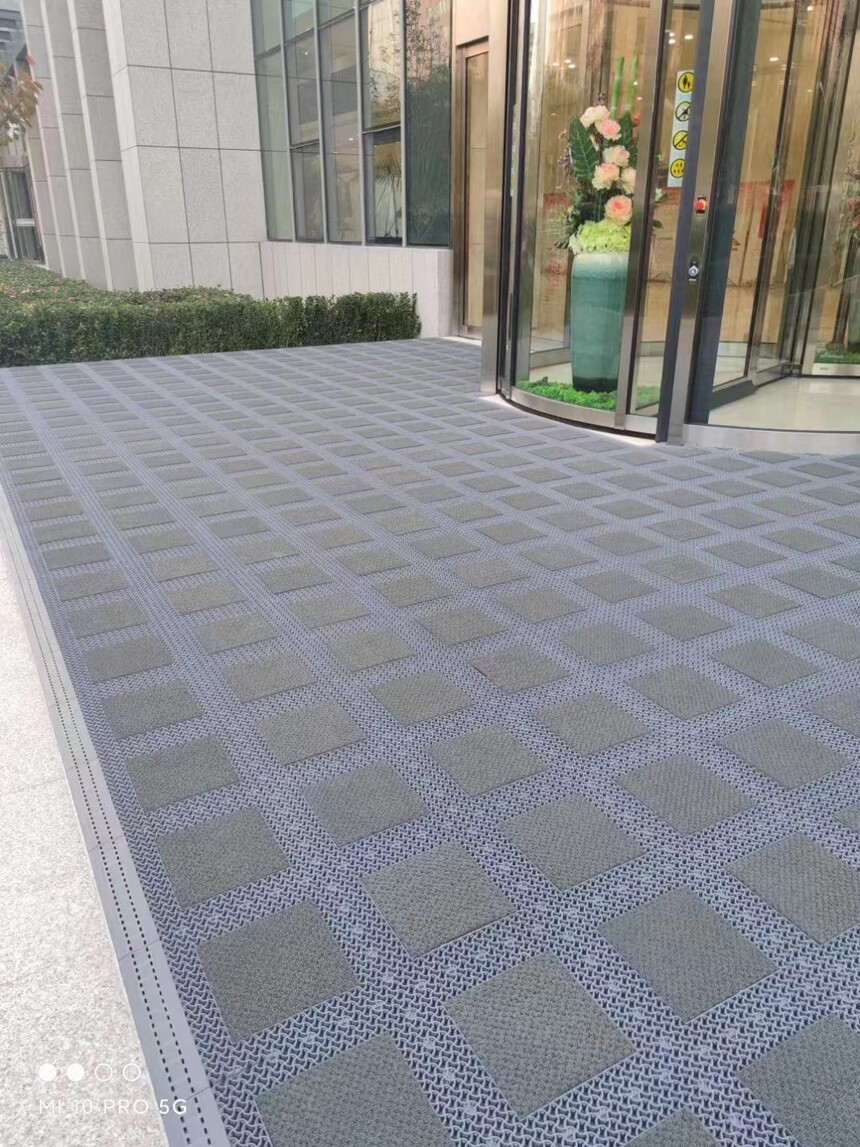 為了銜接酒店門口的旋轉門弧度,通常也有凹槽平鋪的方式,這樣,地面與地墊平齊,顯得整潔自然,端莊秀氣,可采用如下款: 上一篇商場地墊布局下一篇江蘇融達國際大酒店鋁合金地墊分享 |